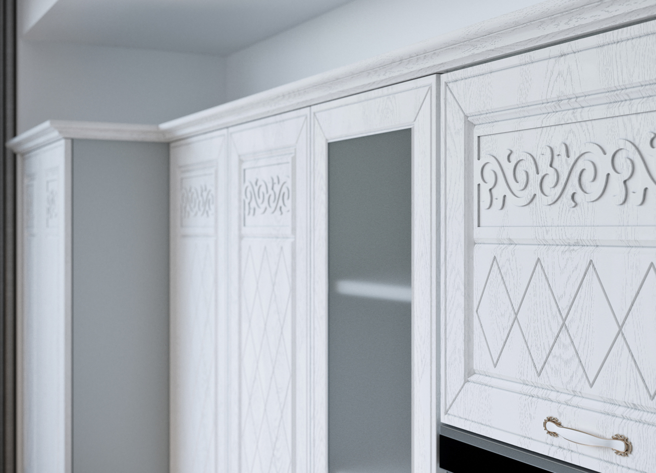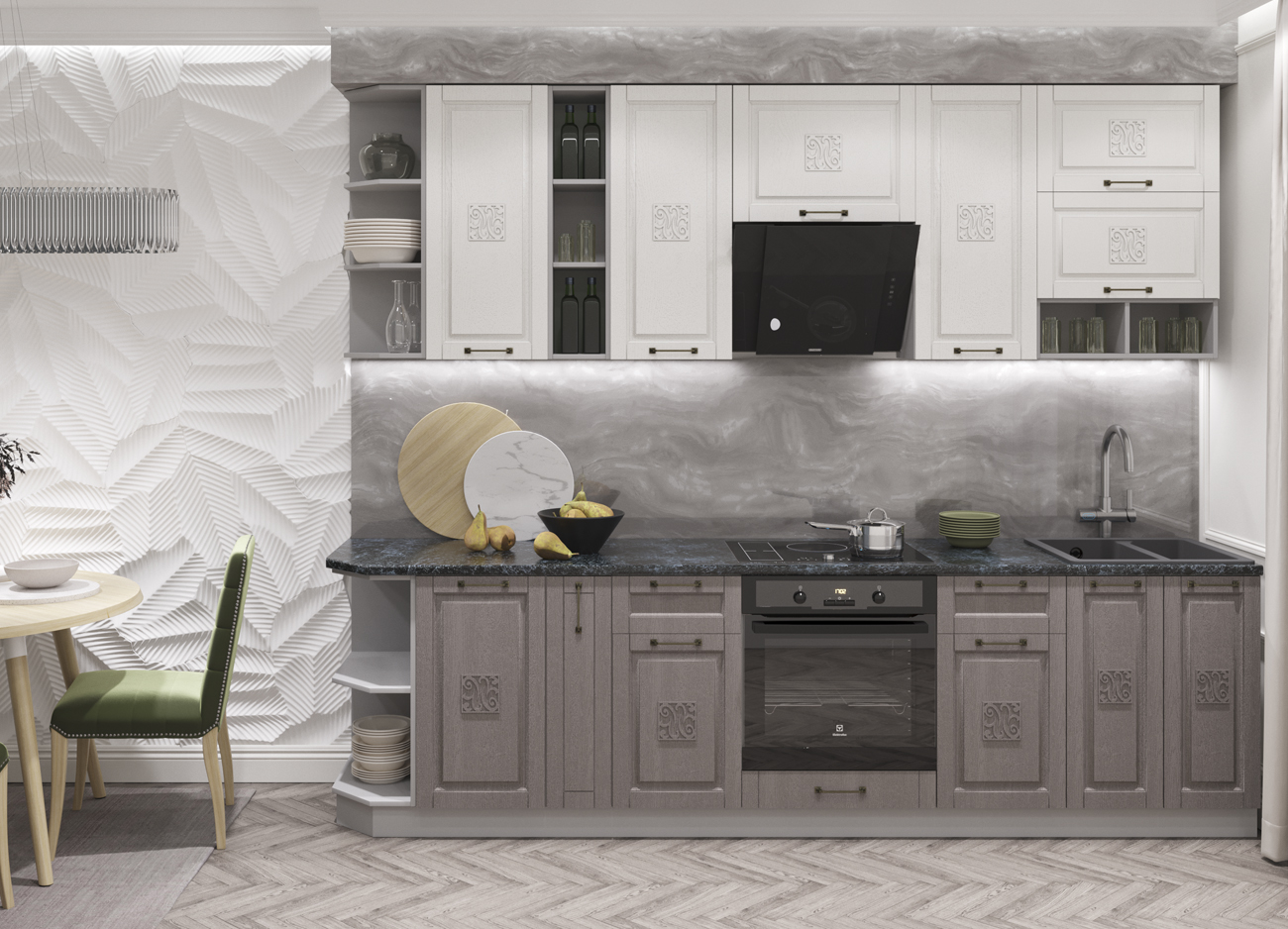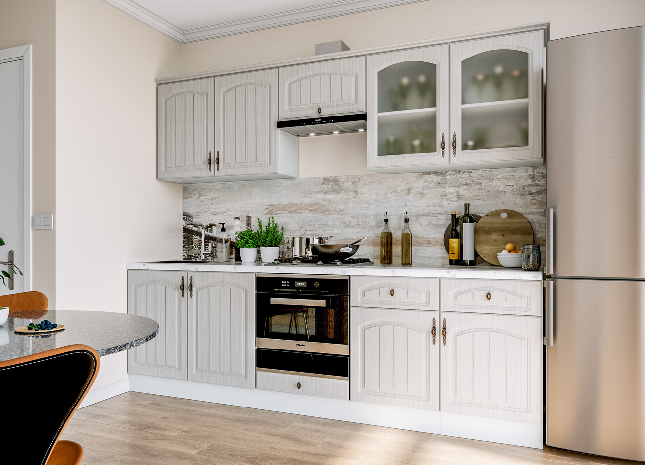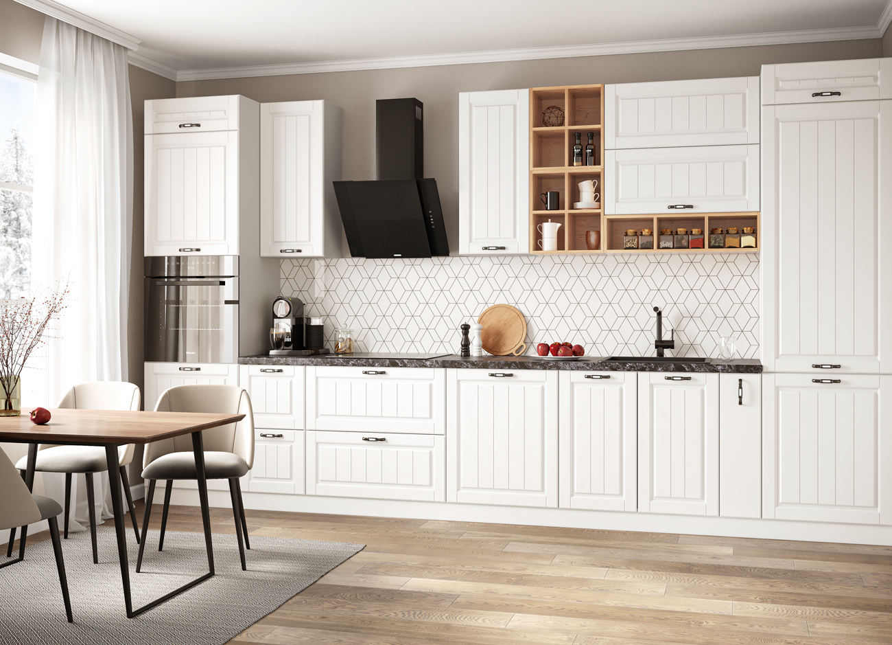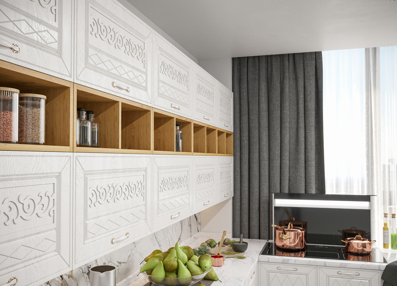 Кухонный гарнитур «Городской прованс», выполненный в стиле неоклассика, сочетает в себе симметричные и четкие геометрические формы, изящные элементы декора и отсутствие излишеств. Сдержанность и лаконичность – основные мотивы линейки «Гарда».