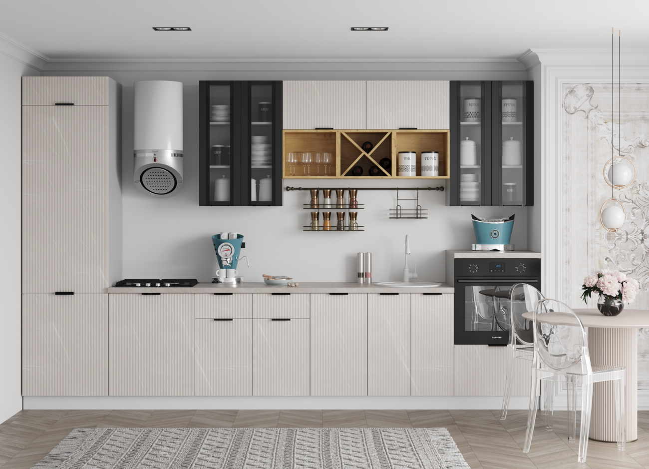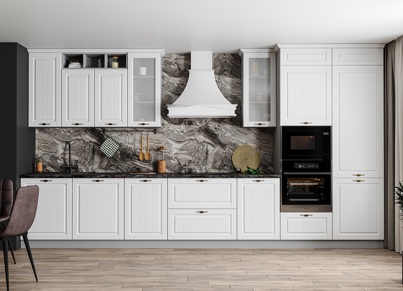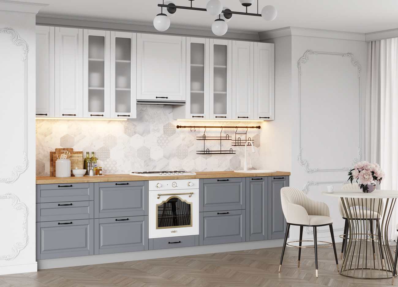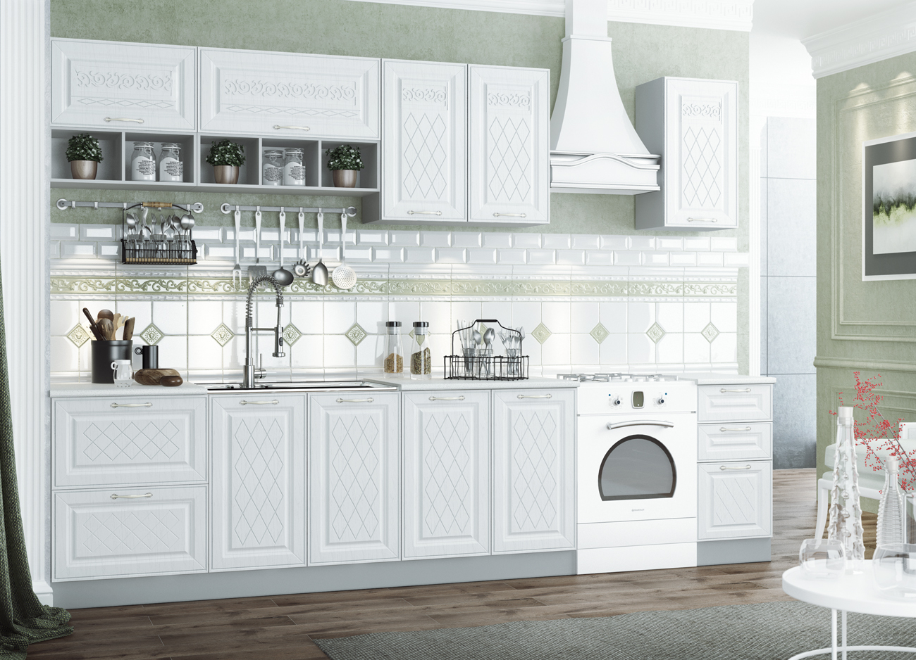Кухонный гарнитур «Городской прованс», выполненный в стиле неоклассика, сочетает в себе симметричные и четкие геометрические формы, изящные элементы декора и отсутствие излишеств. Сдержанность и лаконичность – основные мотивы линейки «Гарда».