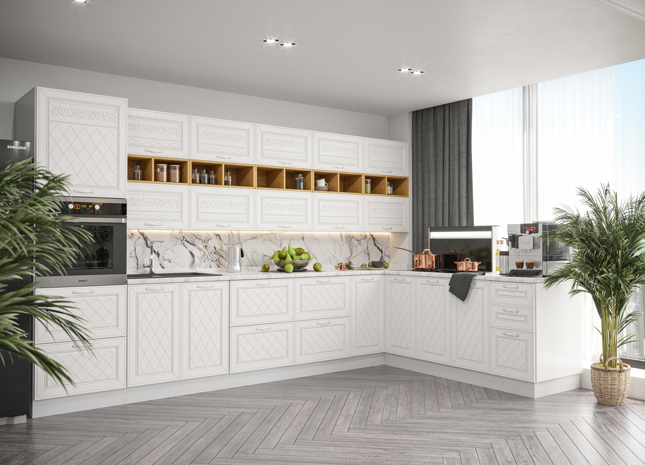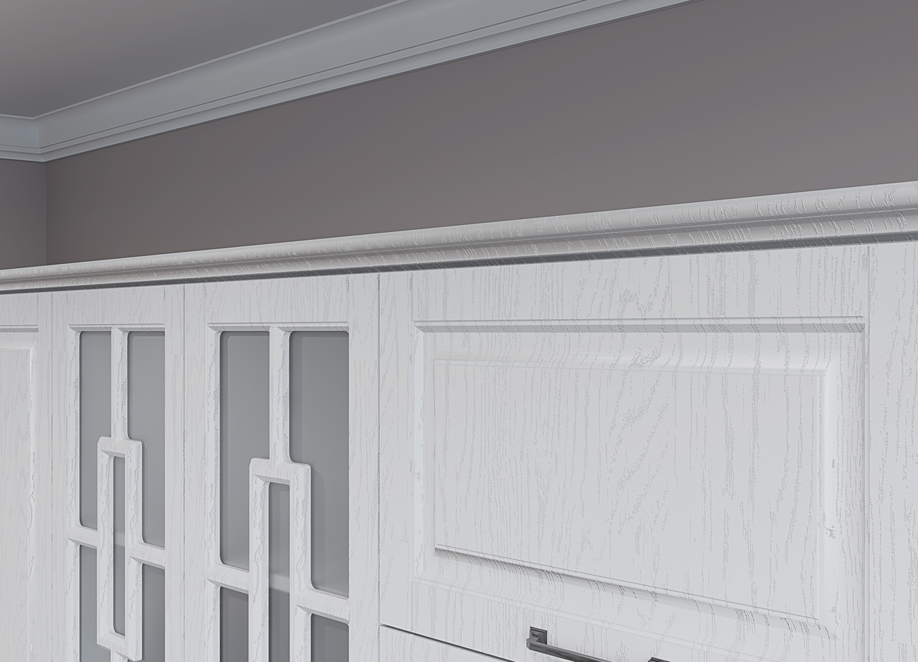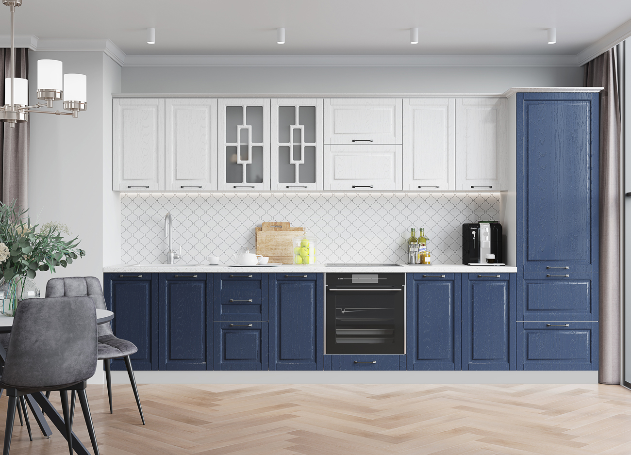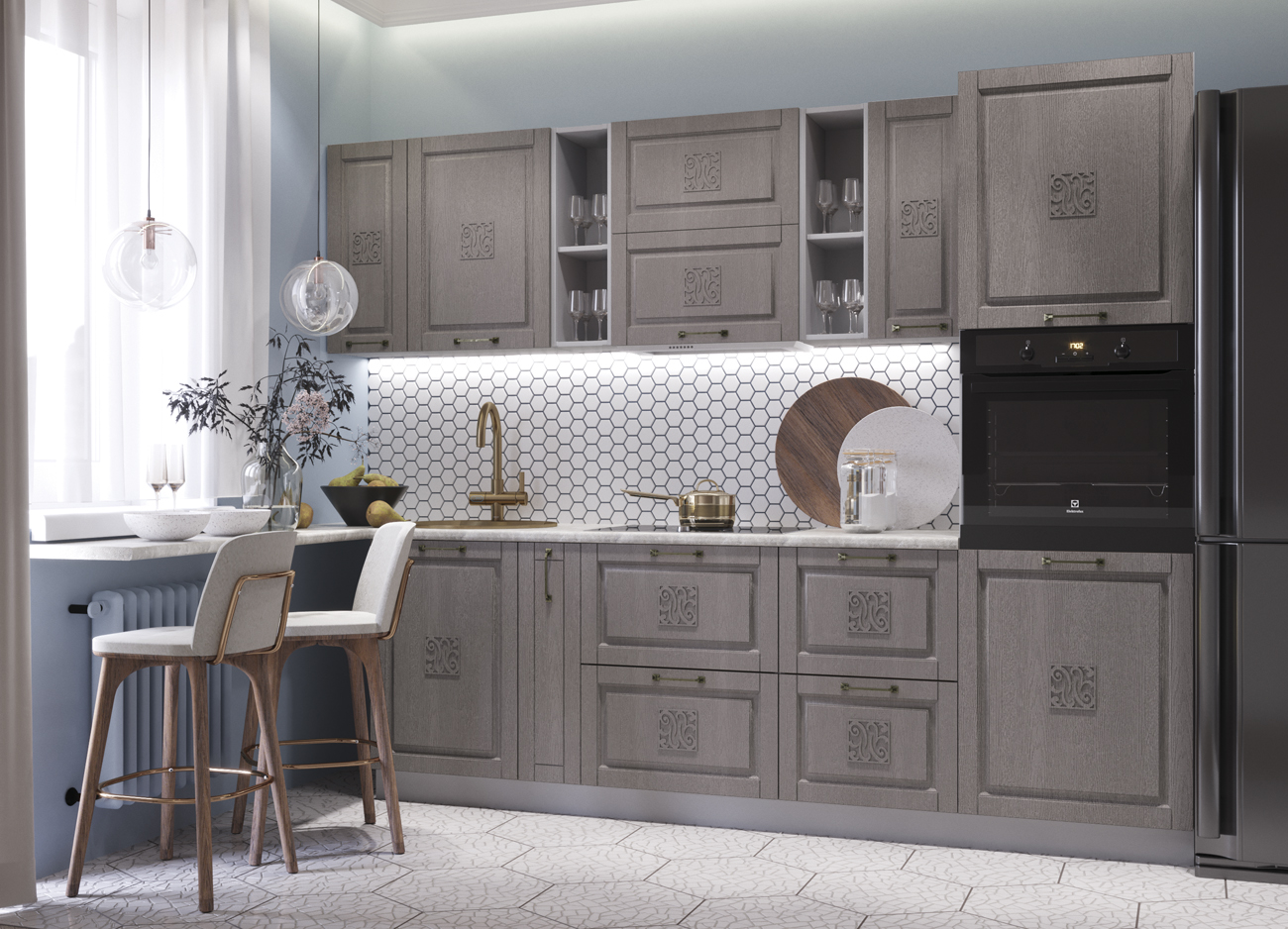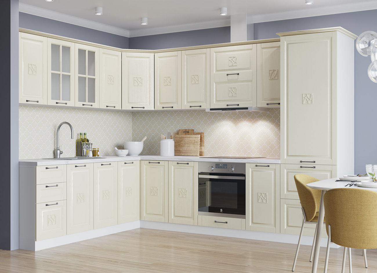 Кухонный гарнитур «Городской прованс», выполненный в стиле неоклассика, сочетает в себе симметричные и четкие геометрические формы, изящные элементы декора и отсутствие излишеств. Сдержанность и лаконичность – основные мотивы линейки «Гарда».