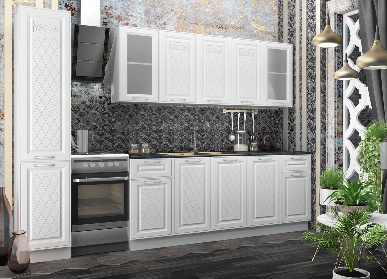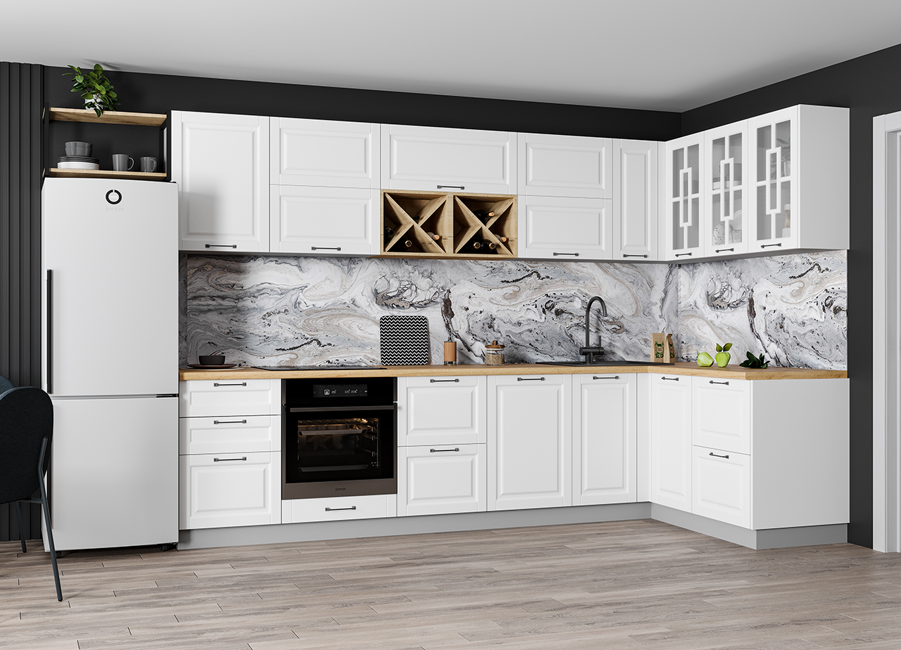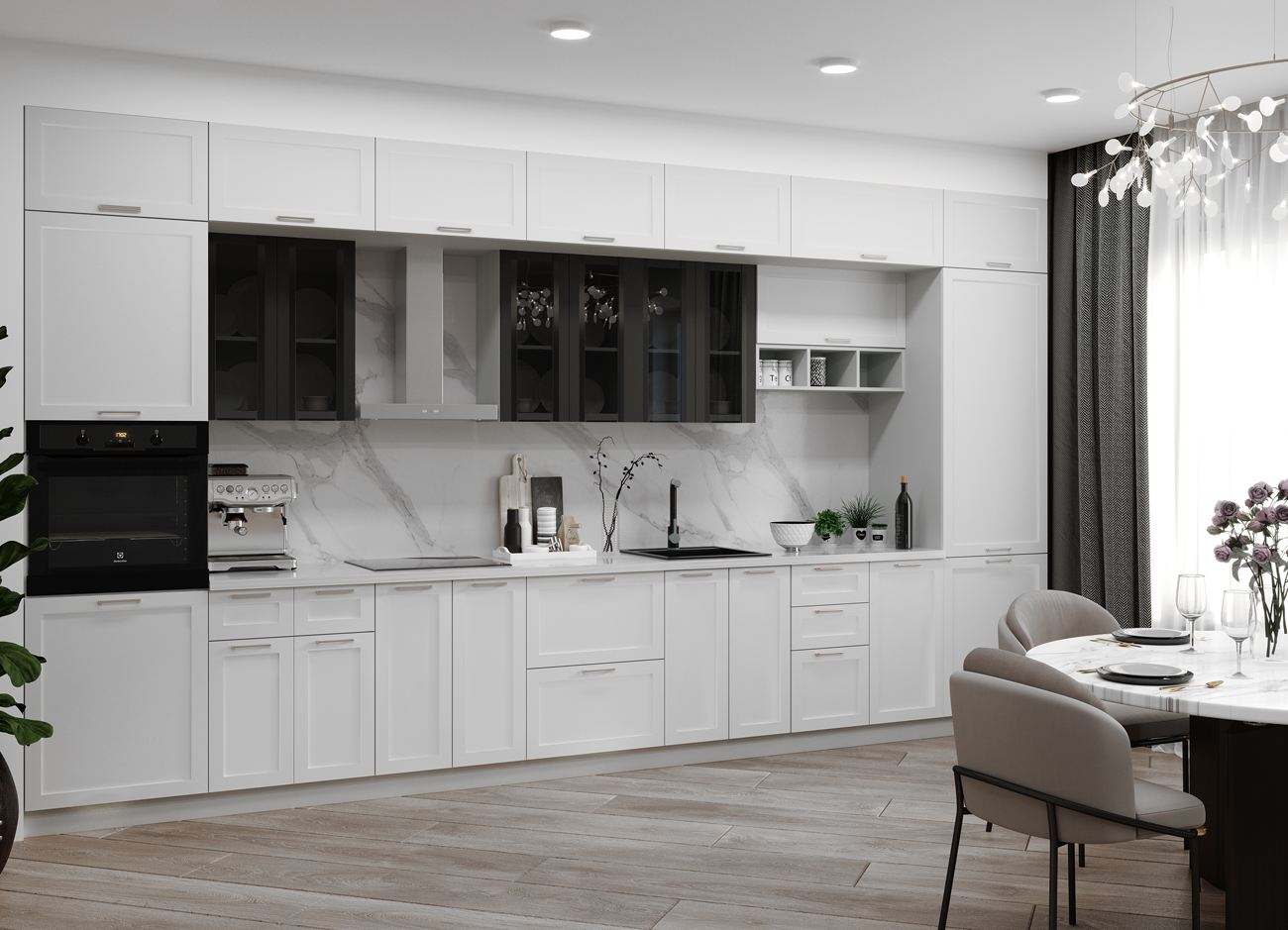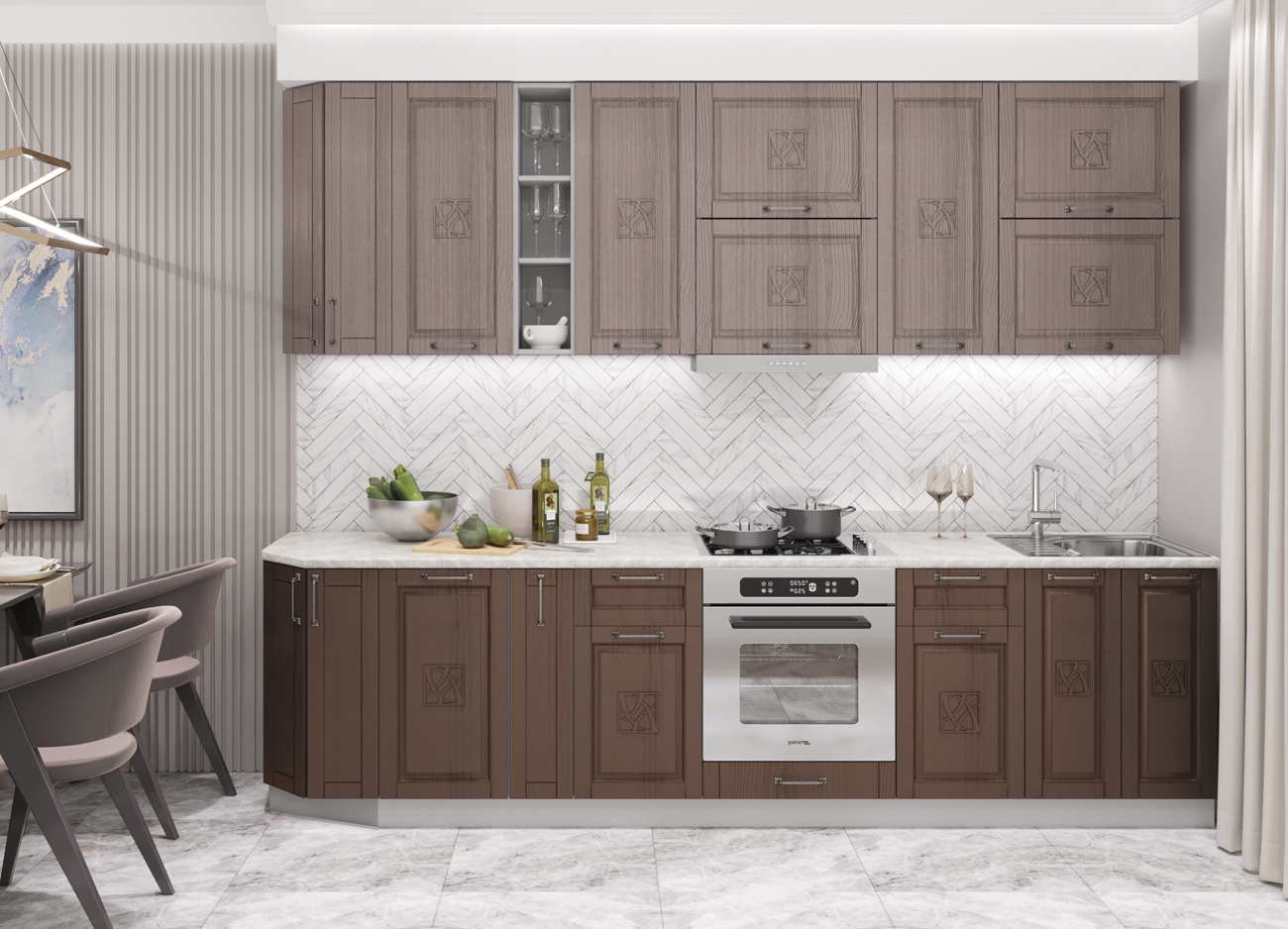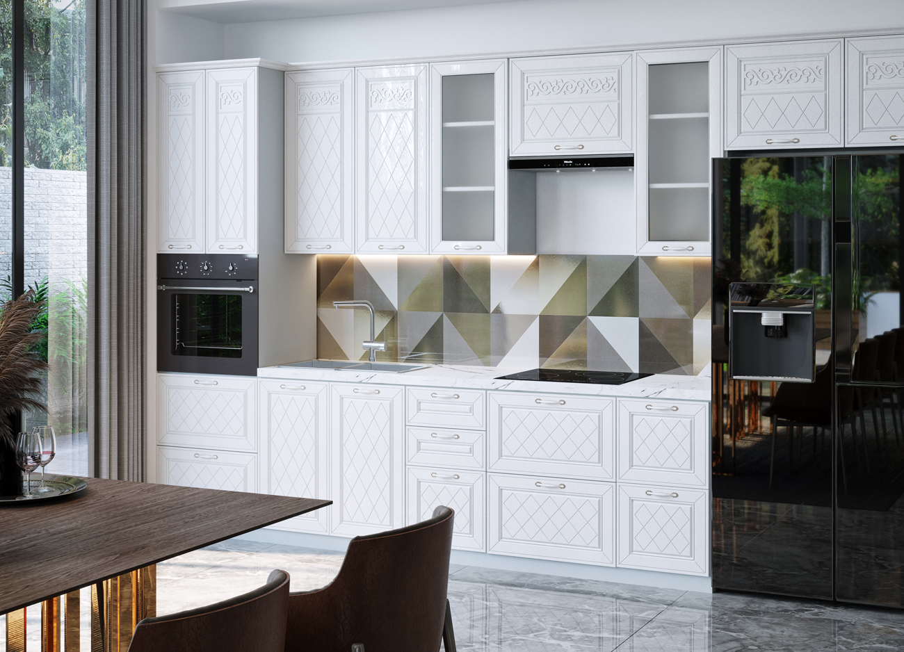 Кухонный гарнитур «Городской прованс», выполненный в стиле неоклассика, сочетает в себе симметричные и четкие геометрические формы, изящные элементы декора и отсутствие излишеств. Сдержанность и лаконичность – основные мотивы линейки «Гарда».