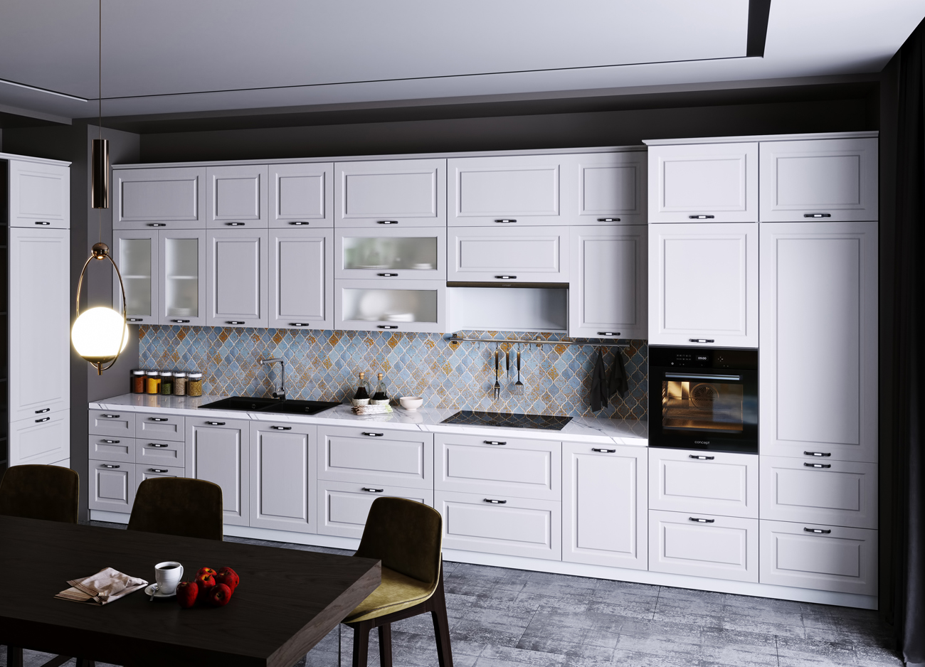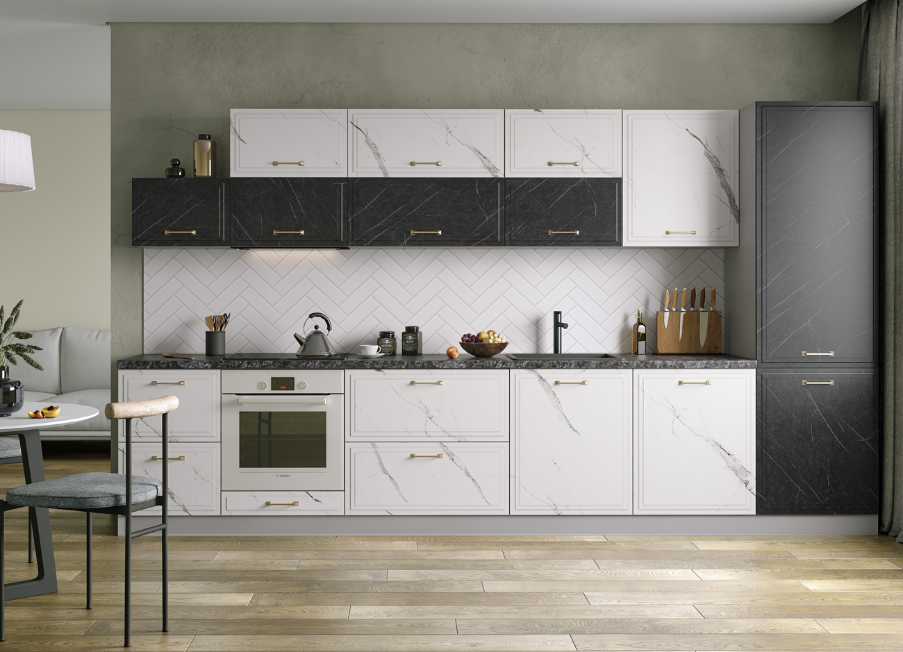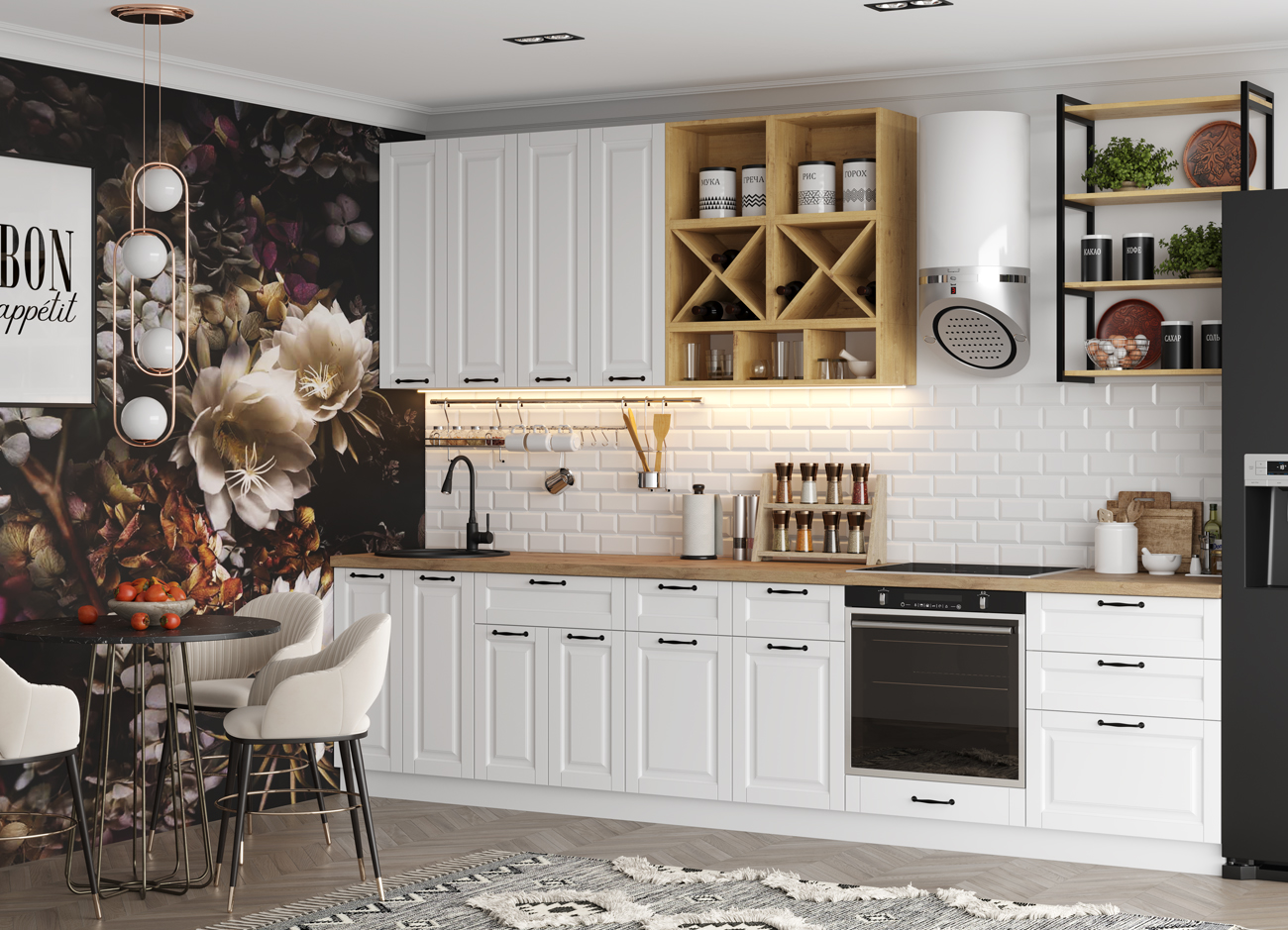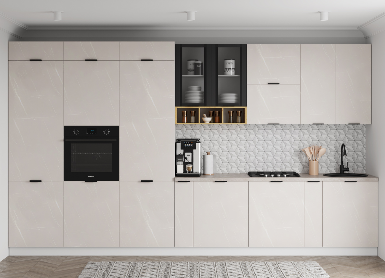 Кухонный гарнитур «Городской прованс», выполненный в стиле неоклассика, сочетает в себе симметричные и четкие геометрические формы, изящные элементы декора и отсутствие излишеств. Сдержанность и лаконичность – основные мотивы линейки «Гарда».