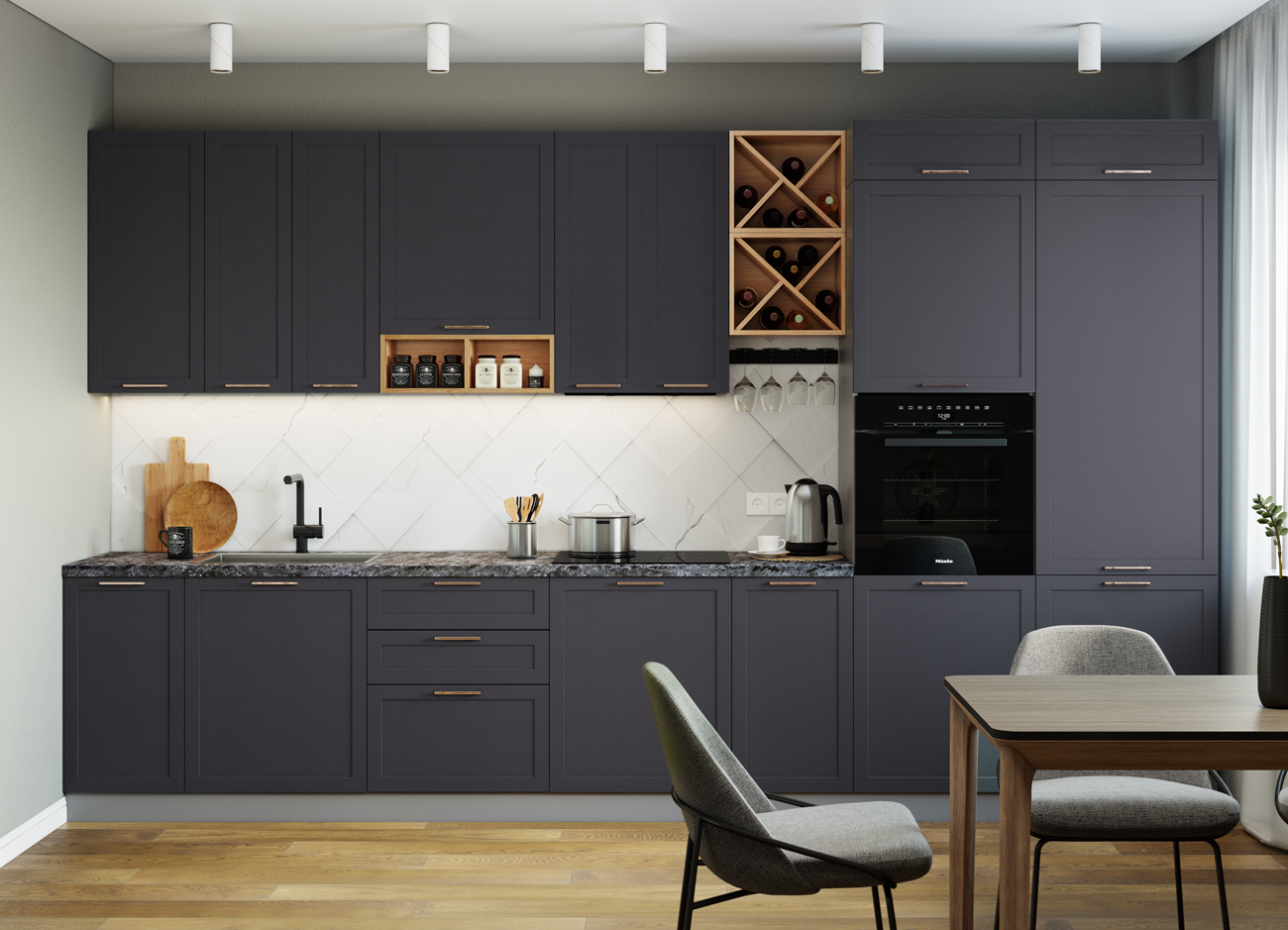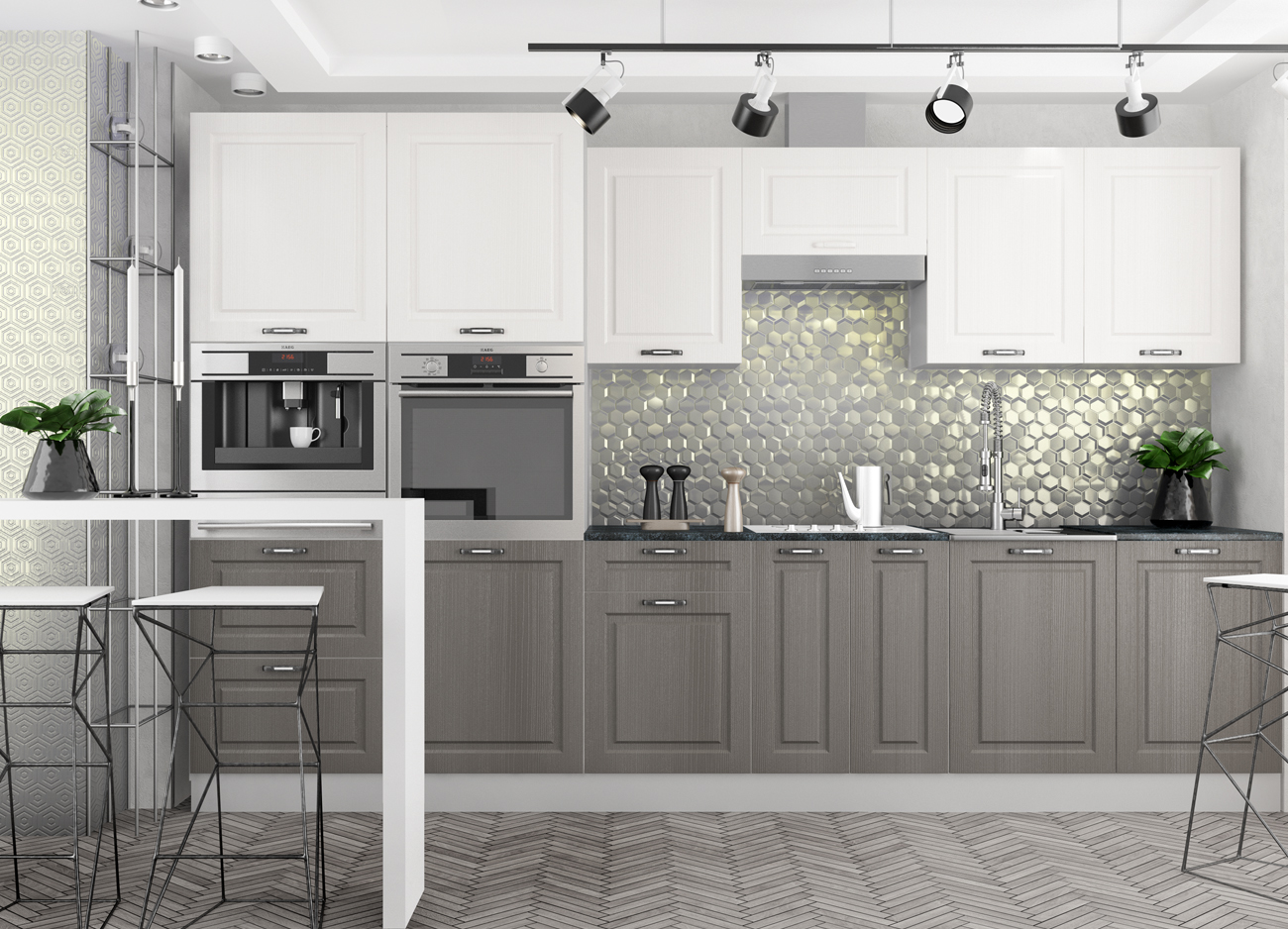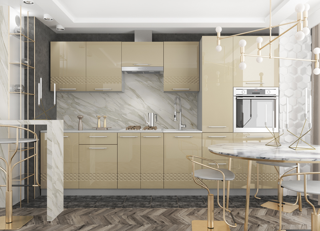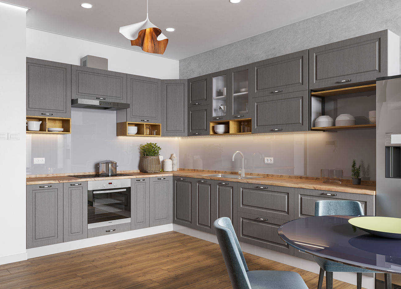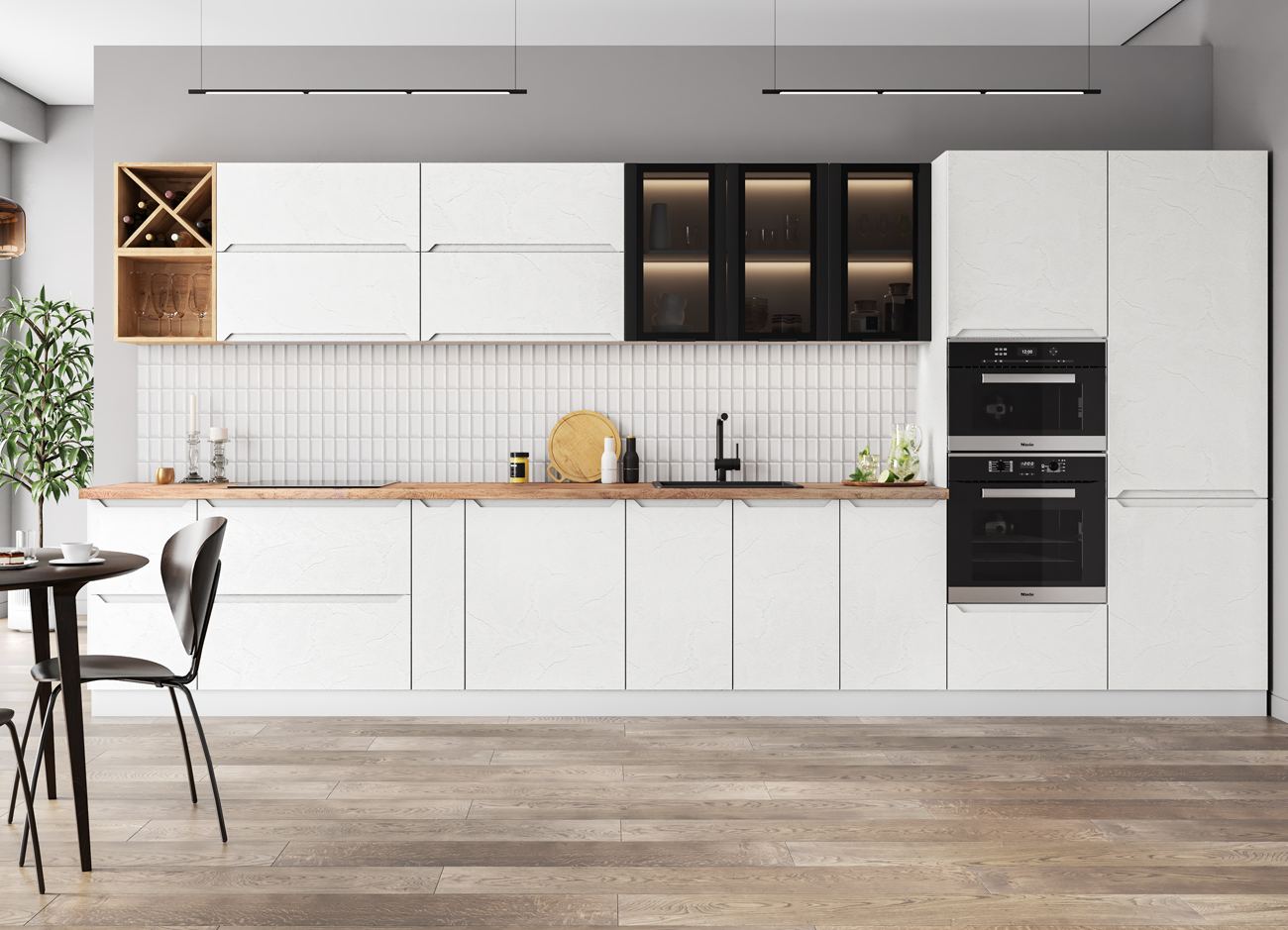 Кухонный гарнитур «Городской прованс», выполненный в стиле неоклассика, сочетает в себе симметричные и четкие геометрические формы, изящные элементы декора и отсутствие излишеств. Сдержанность и лаконичность – основные мотивы линейки «Гарда».