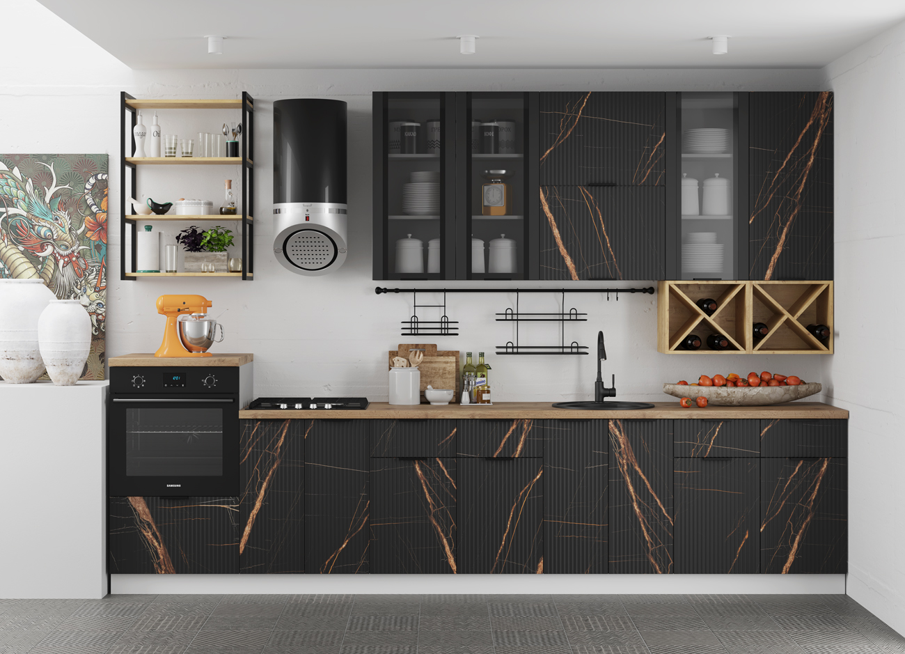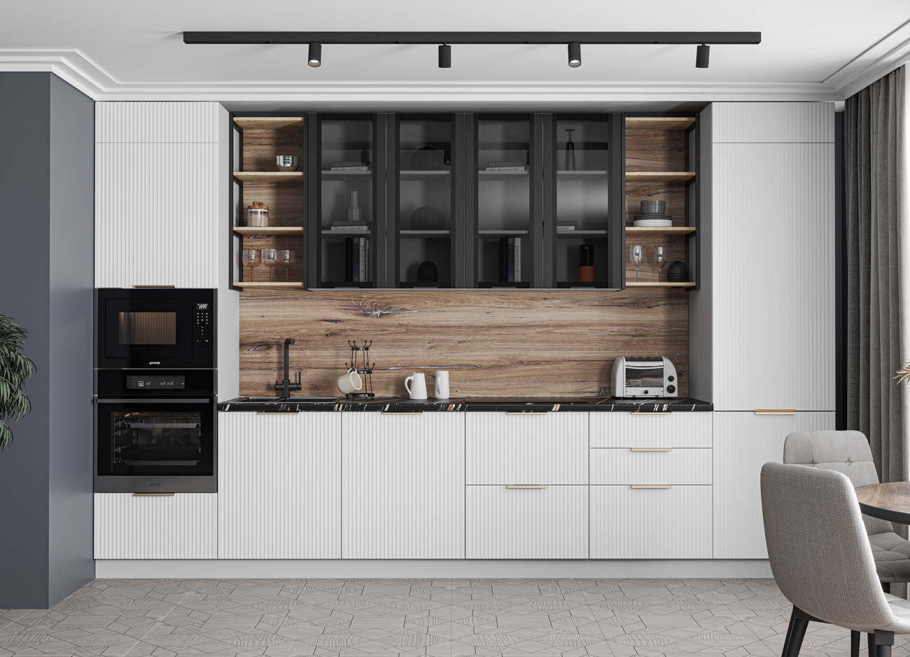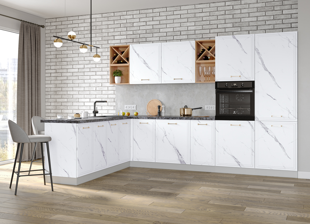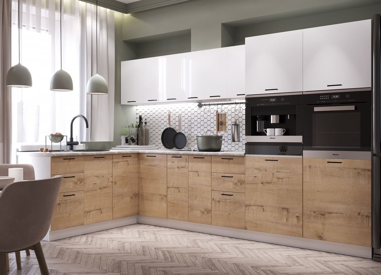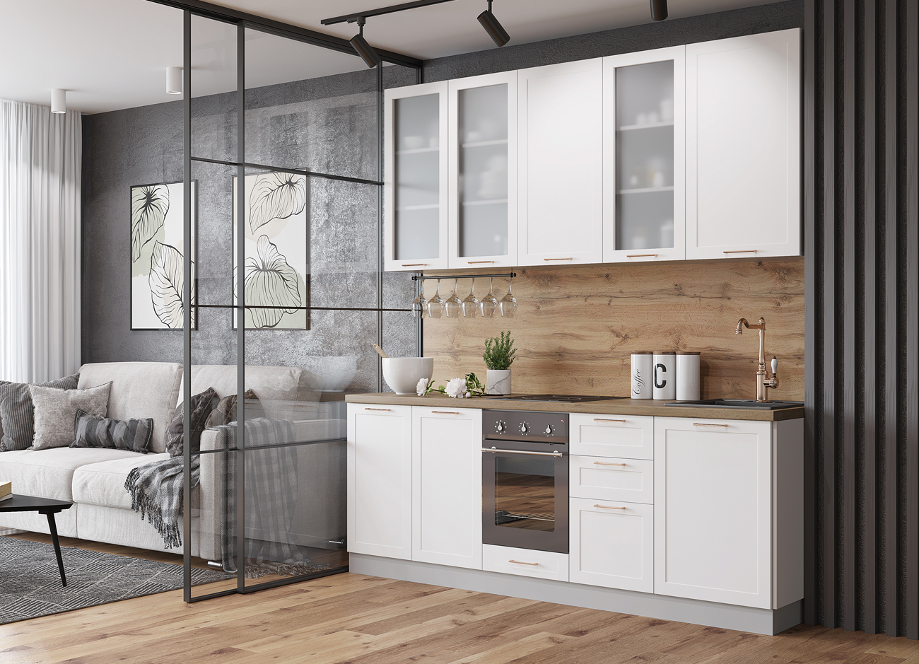 Кухонный гарнитур «Городской прованс», выполненный в стиле неоклассика, сочетает в себе симметричные и четкие геометрические формы, изящные элементы декора и отсутствие излишеств. Сдержанность и лаконичность – основные мотивы линейки «Гарда».
