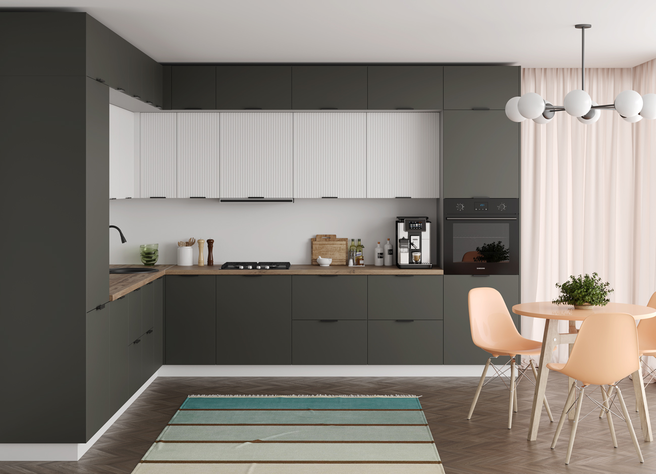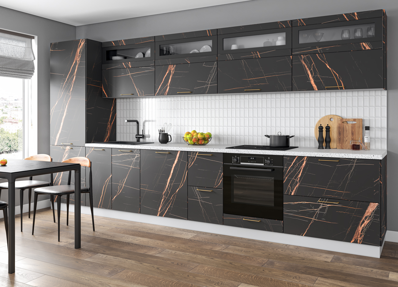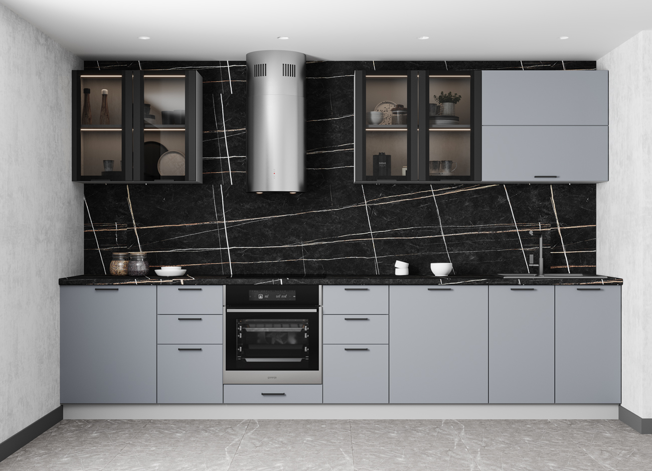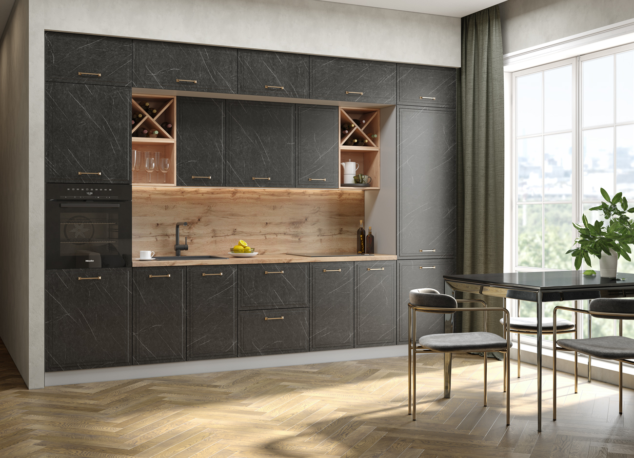 Кухонный гарнитур «Городской прованс», выполненный в стиле неоклассика, сочетает в себе симметричные и четкие геометрические формы, изящные элементы декора и отсутствие излишеств. Сдержанность и лаконичность – основные мотивы линейки «Гарда».